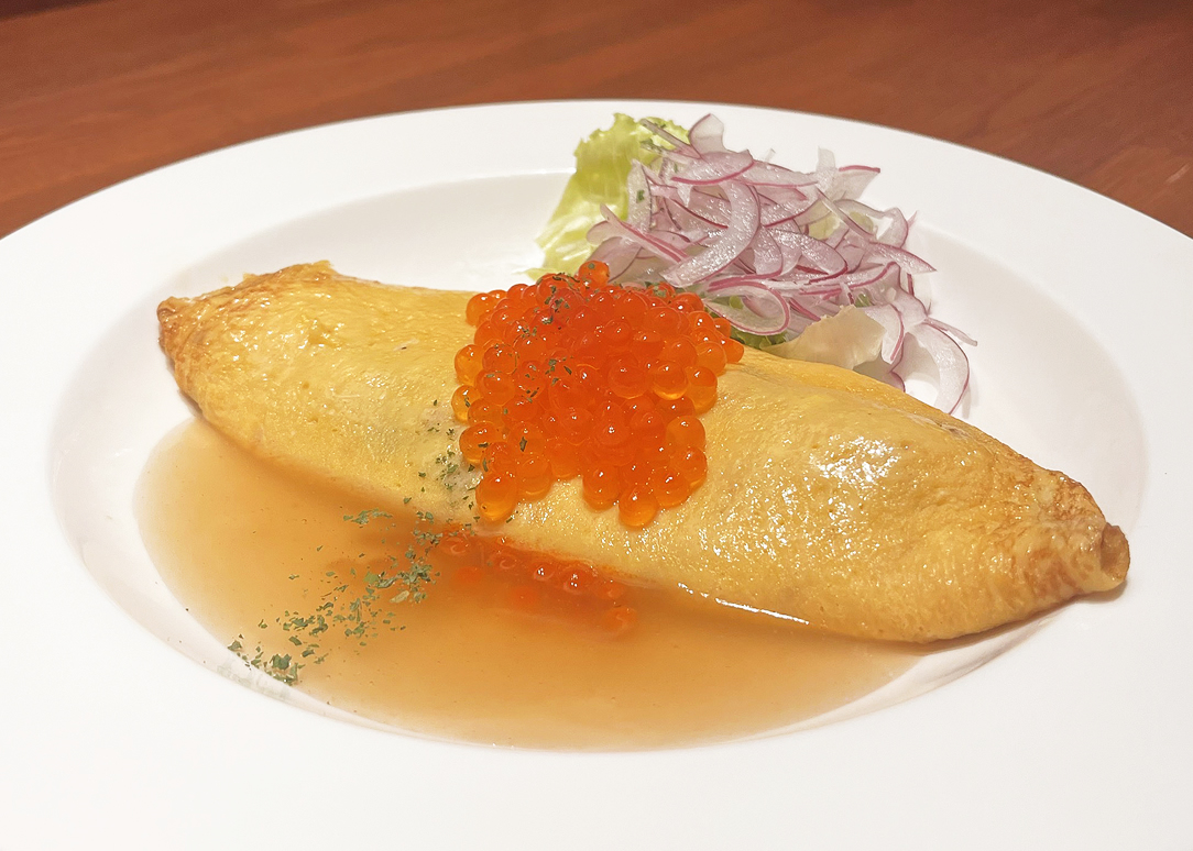 サーモン入りのオムレツに「シラリカいくら」を乗せたメニューです。 |
